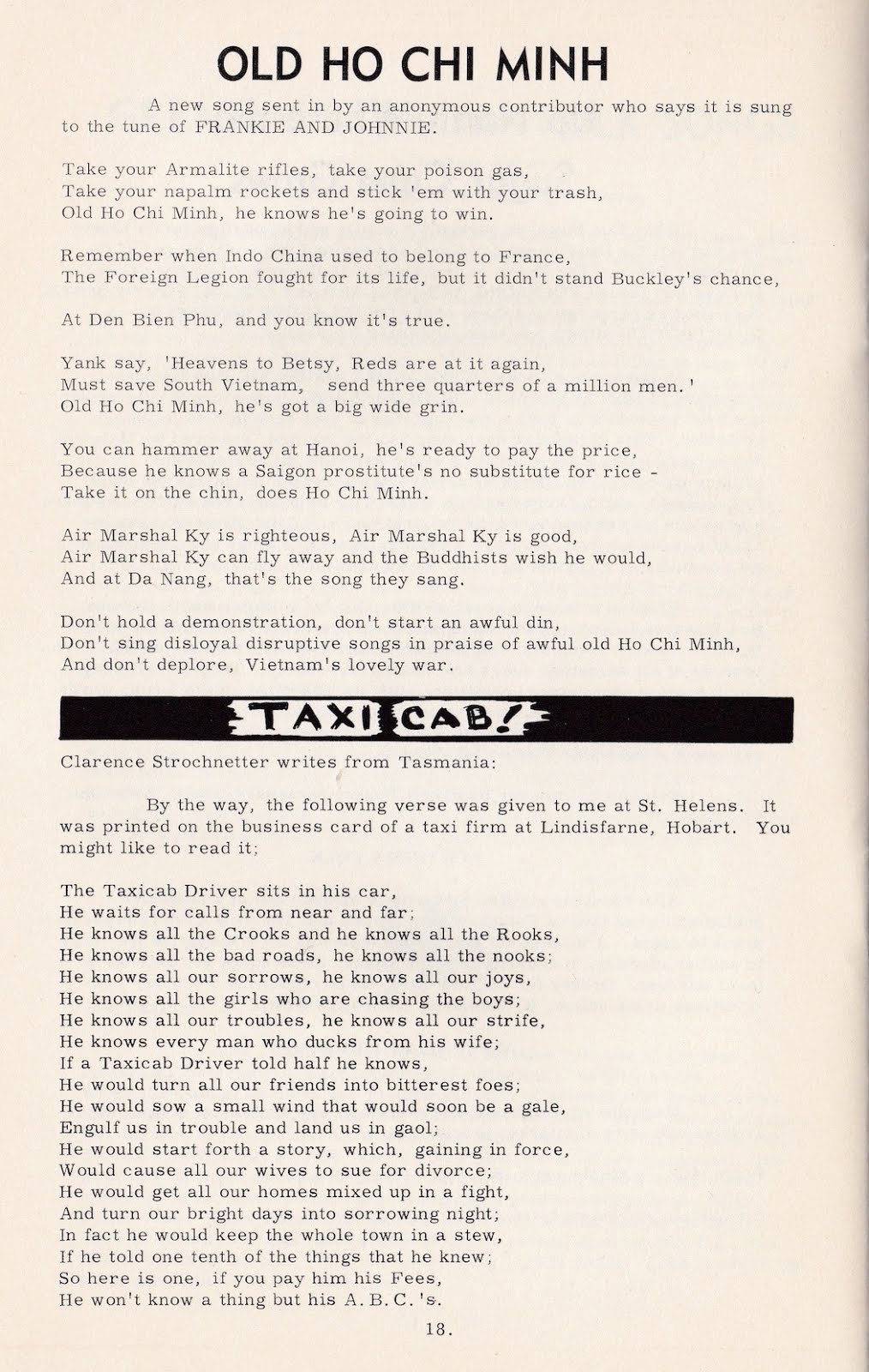 Subject: RE: Vietnam era protest songs From: Sandra in Sydney Date: 16 Nov 20 - 08:49 AM I've just been told by John's old mate Old Ho Chi Minh was written by John Dengate who had supplied a few other songs in the same issue of Singabout. The original second line went: Take your napalm rockets and shove them them right up your ... er ... shirt. The fourth verse finishes with: Takes (not Take) it on the chin ... or the second line could have been "stick ‘em up your arse" according to his wife, or more likely, different versions were sung at different times! sandra |