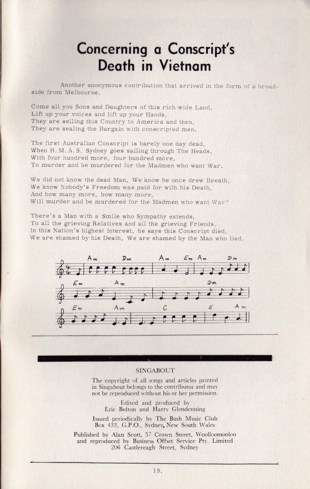Subject: RE: LYR ADD-Concerning a conscript's death in Vie From: Sandra in Sydney Date: 14 Nov 20 - 04:14 AM Conscription in Australia In 1964 compulsory national service for 20-year-old males was introduced under the National Service Act 1964. The selection of conscripts was made by a sortition or lottery draw based on date of birth, and conscripts were obligated to give two years' continuous full-time service, followed by a further three years on the active reserve list. The full-time service requirement was reduced to 18 months in October 1971. The Defence Act was amended May 1964 to provide that national servicemen could be obliged to serve overseas, a provision that had been applied only once before, during World War II ... During the late 1960s, domestic opposition to the Vietnam War and conscription grew in Australia. (read on) Concerning a Conscript's Death in Vietnam, Singabout, Journal of Australian Folksong 6(1), 1966, page 19 Another anonymous contribution that arrived in the form of a broadside from Melbourne Come all you Sons and Daughters of this rich wide Land, Lift up your voices and lift up your Hands, They are selling this country to America and then, They are sealing the Bargain with conscripted men. The first Australian Conscript is barely one day dead, When H.M.A.S. Sydney goes sailing through The Heads, With four hundred more, four hundred more, To murder and be murdered for the Madmen who want War. We did not know the dead Man, We knew he once drew Breath We know Nobody's Freedom was paid for with his Death, And how many more, how many more, Will murder and be murdered for the Madmen who want War? There's a Man with a Smile who Sympathy extends, To all the grieving Relatives and all the grieving Friends, In this Nation's highest interest, he says the Conscript died, We are shamed by his Death, We are shamed by the Man who died. Errol Wayne Noack, 24th May 1966 HMAS Sydney was based at Garden Island Naval Base in Sydney & made 25 voyages to Vietnam between 1965 and 1972. |